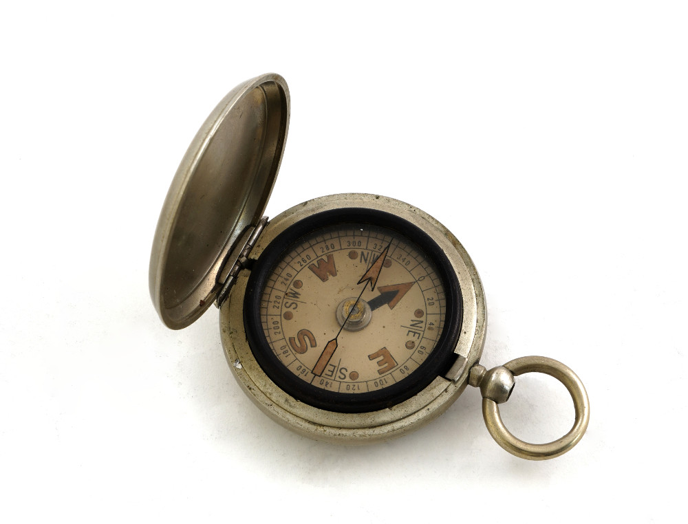 Bussola da tasca, cassa in acciaio, disco con applicazioni luminose in pasta al radio,