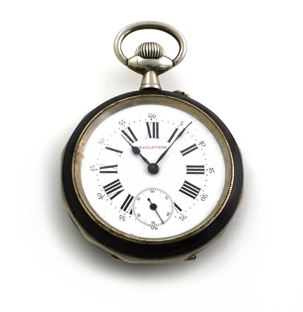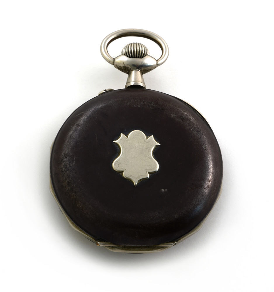 Grande orologio da tasca, movimento con scappamento ad ancora, cassa in acciaio brunito con castello dodecagonale,