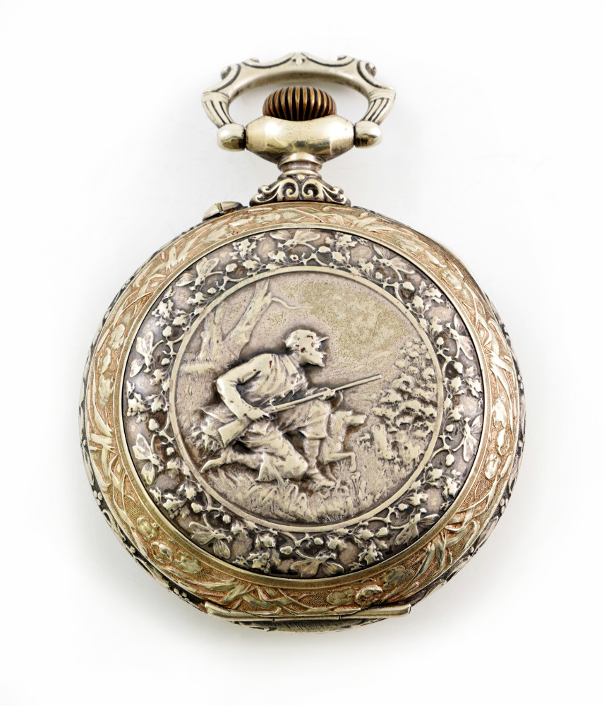 Nr 63 Grande orologio da tasca, cassa in ”argentan” con scena di caccia sul fondello, movimento anonimo,