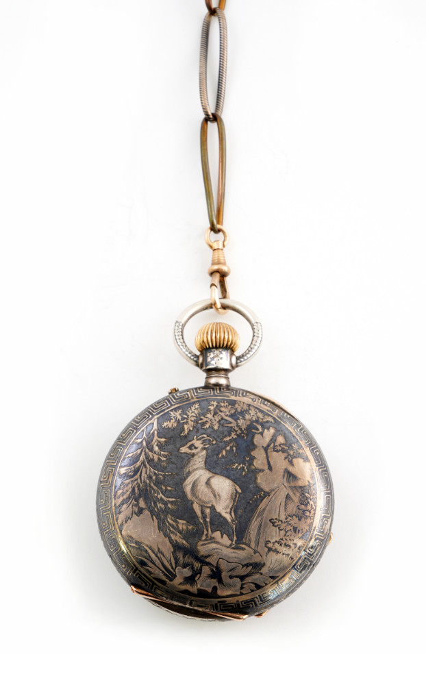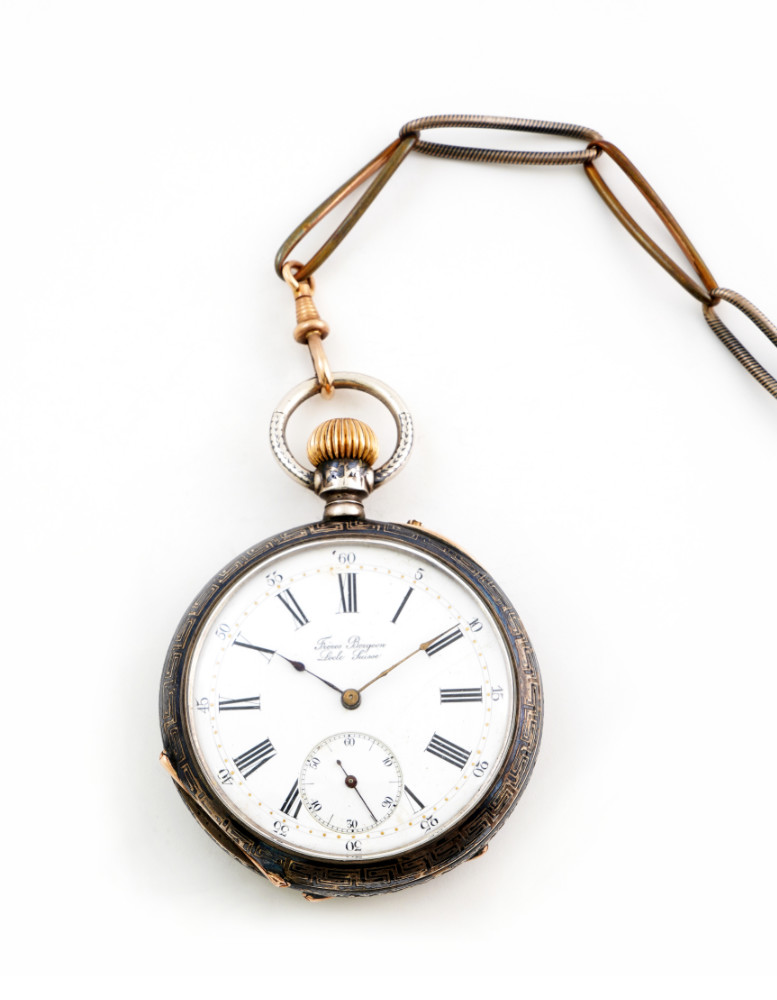 Orologio da tasca, cassa in argento con decorazioni a niello, movimento firmato e decorato, Fréres Bergeon,