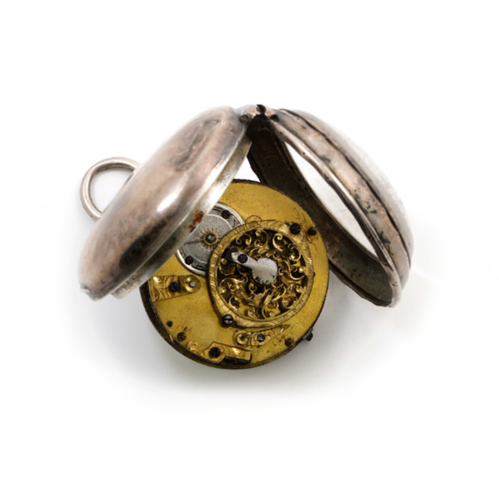 Orologio da tasca, cassa in argento, movimento a ribalta, scappamento a verga, trasmissione a catena,