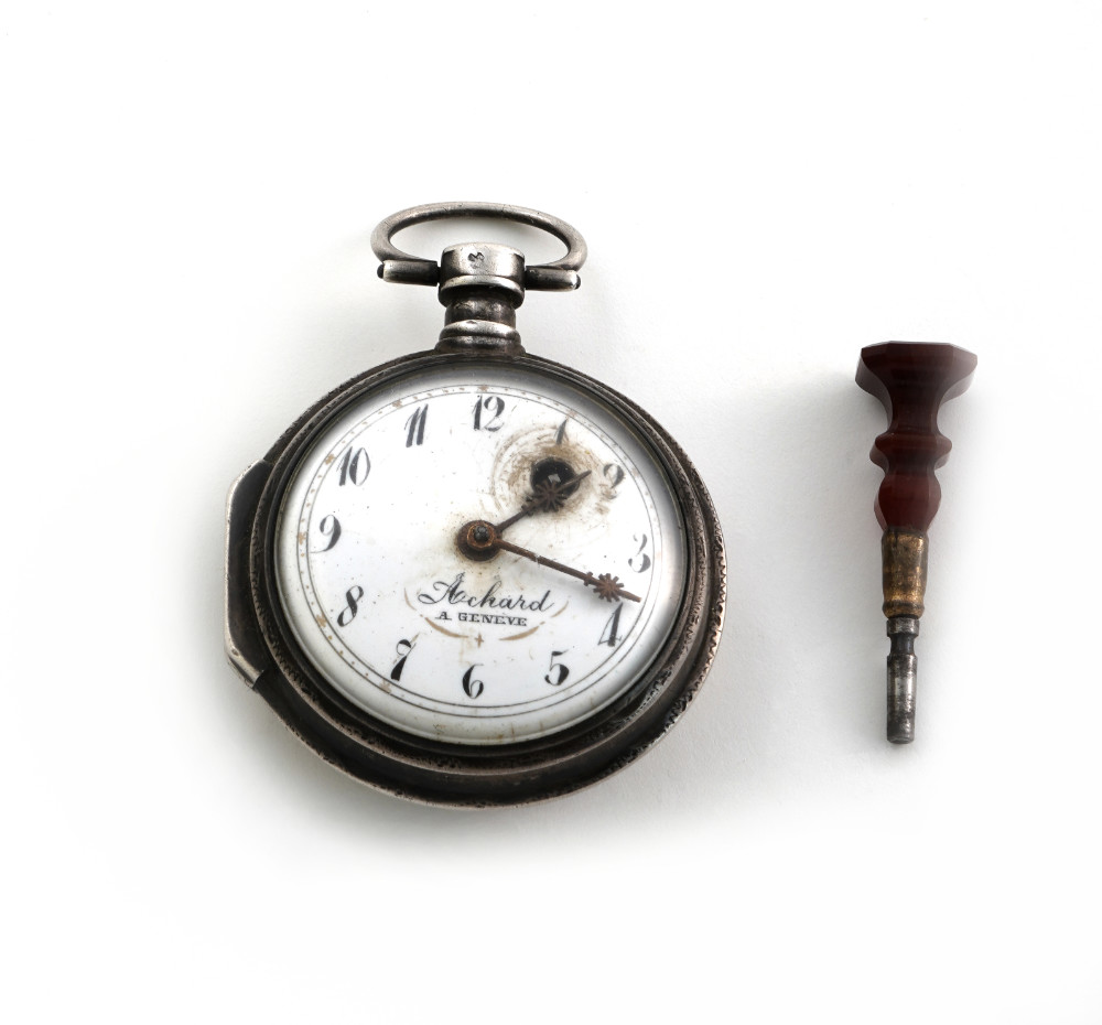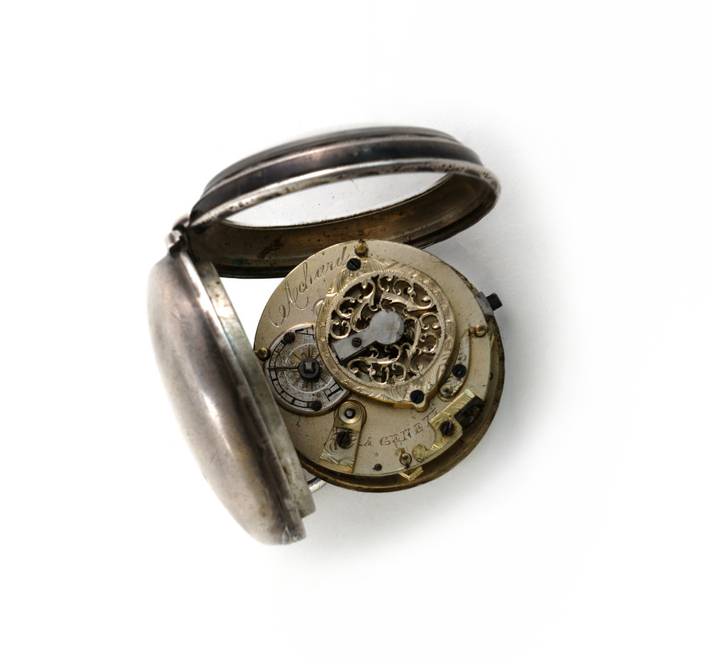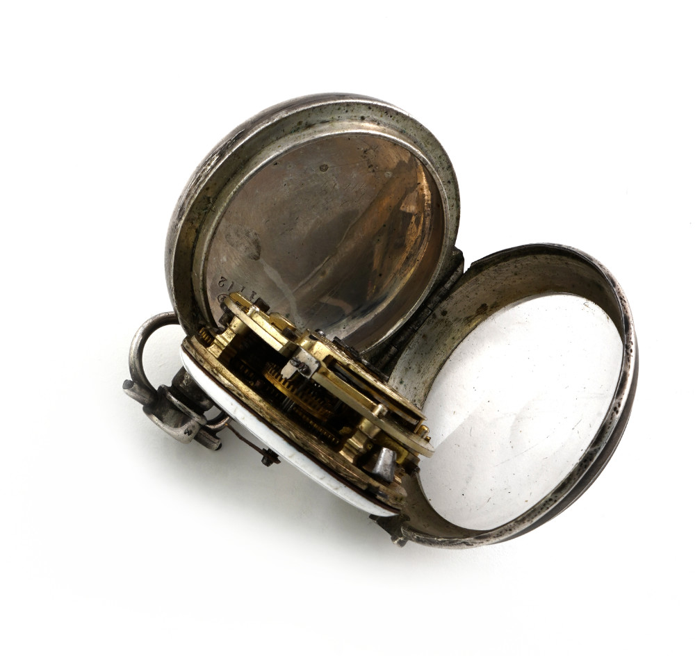 Orologio da tasca, movimento con trasmissione a catena, scappamento a verga, cassa in argento,