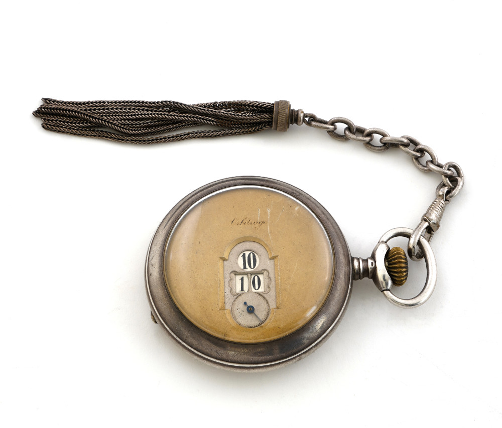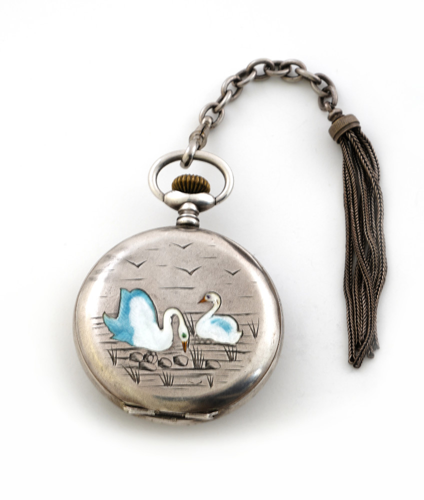 Orologio da tasca saltarello, ore e minuti saltanti, cassa in argento con incisione smaltata,