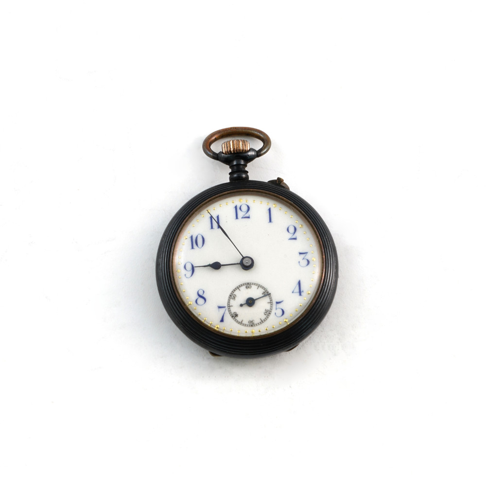 Piccolo orologio da tasca, movimento con scappamento a cilindro, cassa in metallo brunito,